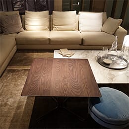 オークとウォルナットで全体の約70%を閉める二大樹種トレンドが今年も継続しています。去年はオークの比率が少し下がり、ウォルナットの存在感が増しましたが、今年ははまたさらにウォルナットが多くなった印象です。その背景としては、カラートレンドであるアースカラーとの相性が良いことが挙げられます。その流れから、オークに関しても、モカやブラウンなど濃色に仕上げたものが多く見られました。また、熱処理(スモーク)で濃色に着色されたユーカリも去年に引き続き、「Molteni&C」、「Casa Milano」をはじめ多くのメーカーで確認できました。