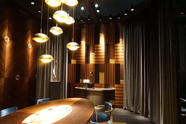木質においては、今年も、オークとウォルナットの二大樹種で60%以上を占めるトレンドが継続しています。また、一昨年頃より出てきたユーカリは定番化してきました。昨年と違うのは、赤や、オレンジ、カッパー色といったカラートレンドに伴い、マホガニーやローズウッド、パリサンダーといった樹種が出てきたことです。そして、それらの樹種では、天然木ならではのダイナミックな「杢」や「照り」を効果的に使い、素材の持つ躍動感を演出していました。昨今、ヨーロッパにおいて、石目はセラミックのグラビア印刷が少しずつ増えてきている反面、木目のプリントは後退していると言われるのは、木が有機体(生物)であるため、本質的に人工物には置き換えできないからではないかと思います。