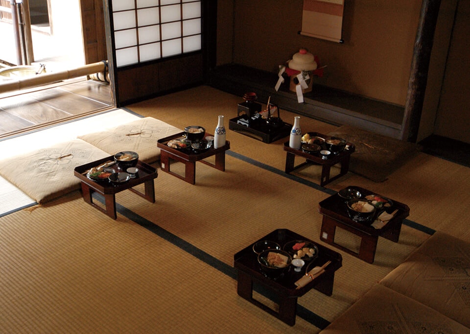 銘々膳(写真:明治村 東松家住宅) 一人ひとりに出す食膳のこと。食事に使用しない場合は食器を収納するのに用い、食事の際には蓋を膳として使用した