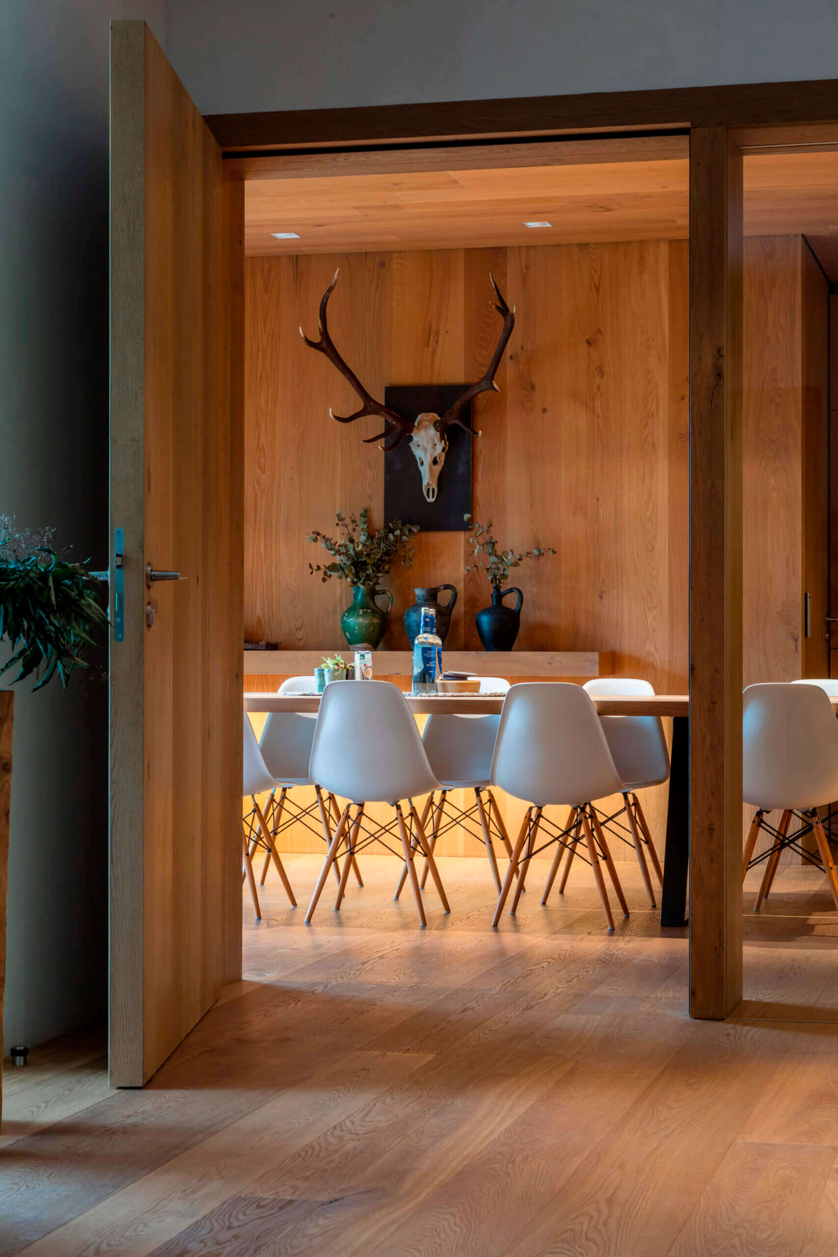 建築そのものはバウハウスの理念を取り入れたボックス形を組み合わせた躯体。エントランスを入っていくと、ご主人がビジネス、プライベートともにゲスト用のサロンとして使用する部屋がありました。床だけでなく、天井と壁にもヨーロッパのオークが一面に張られた心地よい空間でした。