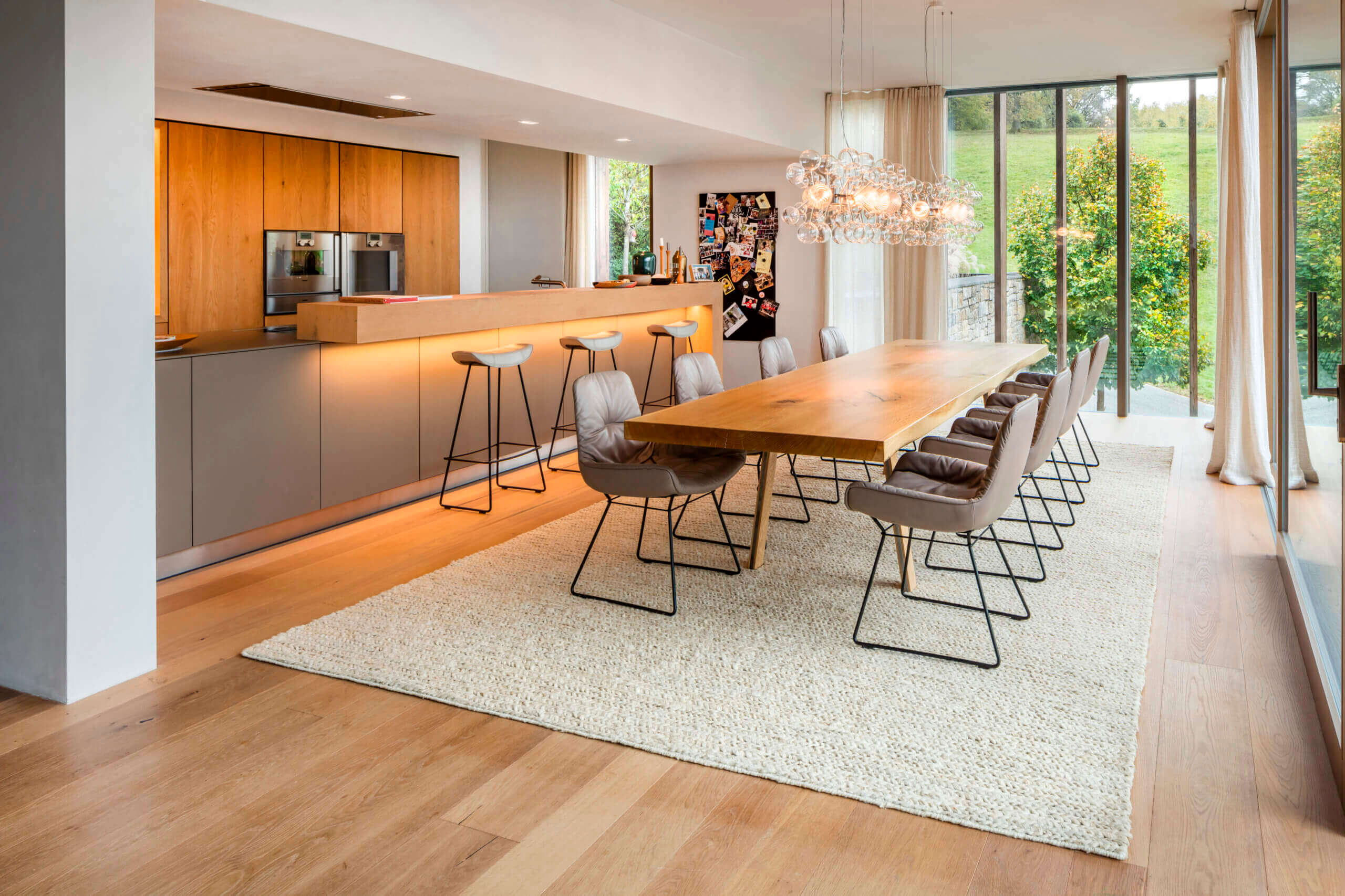パノラマのある広々とした2Fのダイニングキッチン。このダイニングからリビング、廊下までフロア全体に見切りを入れず床材を連続して張るには、大変な技術が必要です。