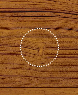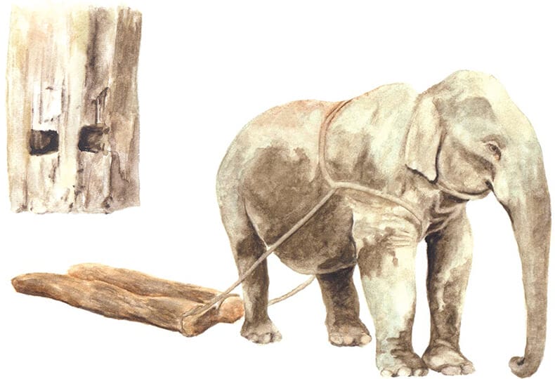 チークが自生しているのは、インド、ラオス、タイ、ミャンマーの4カ国。このなかで現在もチーク材を生産しているのはミャンマーのみです。 ミャンマーのチーク林ではすぐに伐採するのではなく、まずは根元から50cmくらいの樹皮をはぎとり、栄養を運ぶ導管を切断することで木を枯らす「巻き枯らし」を行います。この方法には2〜3年かかりますが、水に浮かぶようになるというのがメリット。重たいチーク材が、川で運搬できるようになるのです。 丸太を林から川辺まで運ぶのはゾウの役割。ゾウが引く鎖を通すために、チークには丸い穴が開けられます。これは「エレファントホール」と呼ばれ、良質の天然チークのシンボルとなっています。