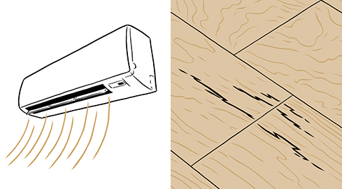 エアコンの暖房を長時間連続して使用すると室内が乾燥しすぎ、フロアの継ぎ目にスキ間ができたり、表面のひび割れを生じたりすることがあります。加湿器などで適度な湿気を補うようにしてください。