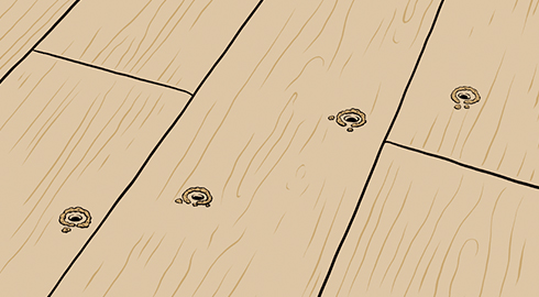 小さな穴があき、木の粉が出てくるなどの現象は、木部についた虫害と考えられます。万一発生した場合は専用薬剤を注入するなど早期対応が必要です。専用薬剤はホームセンターなどでお求めいただけますが、処理専門業者にご相談されることをおすすめいたします。