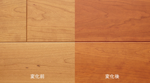 カーペットを敷いた部分や家具を設置した箇所などは、その被いを除けた時、くっきりと周囲と色合いが違う跡が現れます。被いを除けた後そのまま光の影響を受けさせれば、徐々に色合いが変化して周囲と馴染んでいきます。