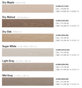 乾燥した無垢材が持つ柔らかな色合い・風合いを表現した「ドライオーク」「ドライウォルナット」「ドライメイプル」やホワイト~グレー系カラー等、トレンドのインテリアスタイルとも相性の良い6色をラインナップ。