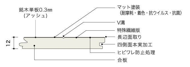 表面にブラッシング加工を施し、道管を強調させる着色塗装仕上げにすることで木目の凹凸感、素材感が増します。また、足触りの良い艶消し塗装でマットに仕上げています。