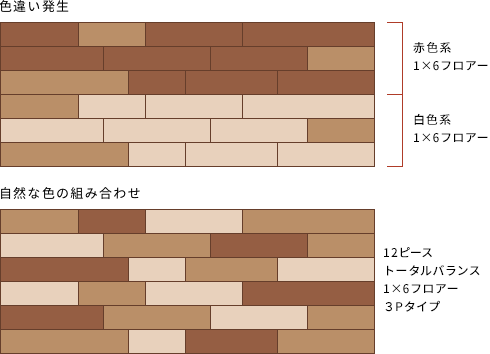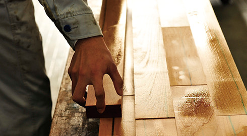 生物材料である木材は、同じ原木でも1 本1 本、また1 本の中でもその材色や木目が異なります。この「不揃い」こそ天然素材であることの証であり、生物材料の木材ならではの特長です。しかし、「不揃い」も過ぎるとデザイン的に好ましくないケースも。実は、見た目に自然な、心地良い印象を与える「不揃い」の程度には最適範囲が存在します。ライブナチュラルプレミアム、ライブナチュラルでは、熟練のクラフトマンが多様性を制御しながら、「不揃い」のバランスの良さを引き出しているのです。